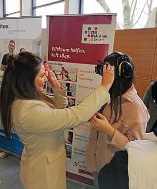 Aussteller waren alle Mitglieder des Ausbilundungsverbundes Groß-Gerau. Als Ansprechpartner war auch die Akademie für Pflege- und Sozialberufe der Mission Leben dabei. Außerdem informierte das Altenpflegeheim An der Fasanerie in Groß-Gerau sowie das Martin-Niemöller-Haus in Rüsselsheim die Schüler*innen über den Pflegeberuf bzw. die Ausbildung zum Pflegefachfach/mann und Altenpflege-Helfer/innen. Den interessierten Schüler*innen wurde am Stand u.a. praktisch gezeigt, wie man richtig die Hände desinfiziert. Außerdem konnten sie sich anhand eines Alterssimulators in die Lage von älteren Menschen mit Einschränkung versetzen.